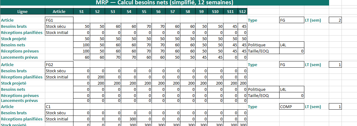 Le MRP ici est à granularité hebdo. Si votre flux est très rapide ou très tendu, déclinez-le à J+1 (mêmes formules, pas le même calendrier)