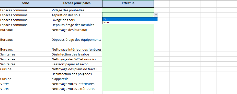 - Une liste détaillée des tâches à effectuer par zone (espaces communs, bureaux, sanitaires, etc.)