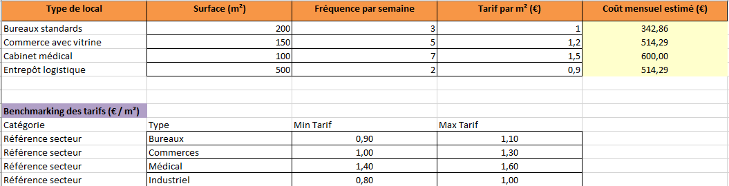 - Tableau de benchmarking des tarifs selon le secteur d’activité (bureaux, médical, industriel…)