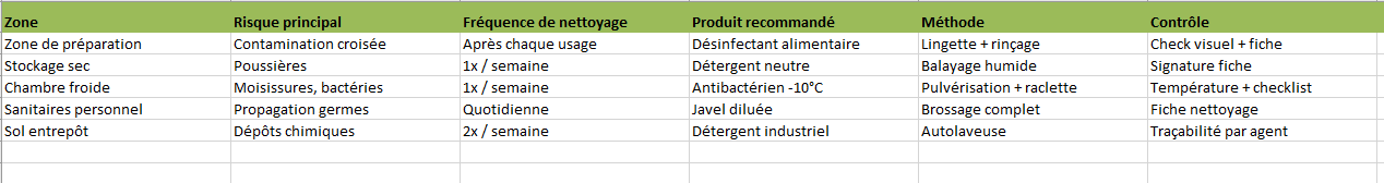 - Décrit pour chaque zone : les risques identifiés, la fréquence de nettoyage, le produit à utiliser, la méthode recommandée et le type de contrôle