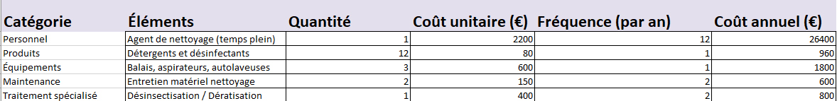 - Formules intégrées pour calcul automatique en fonction de la quantité, fréquence et coût unitaire