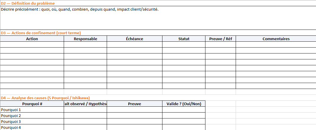 - D7 — Prévention : mise à jour du standard, formation, poka-yoke.