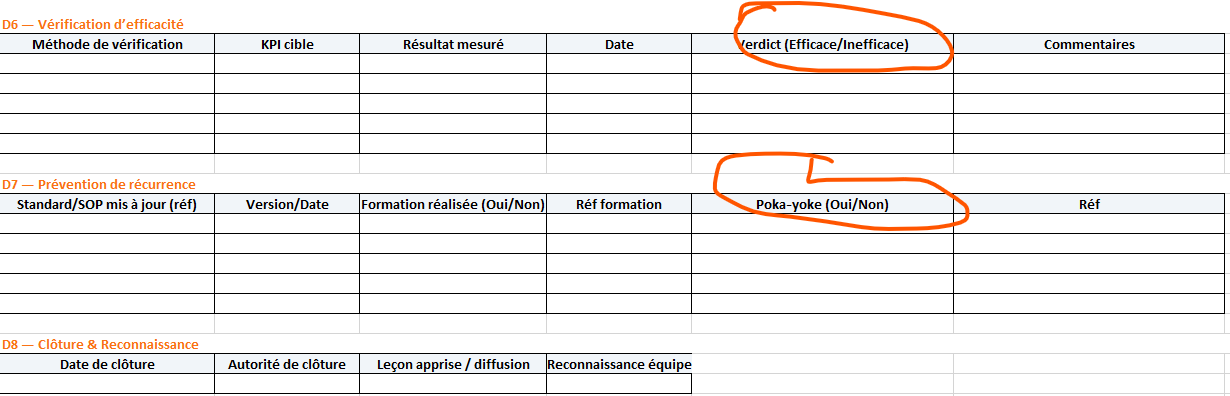 - Clôture sans prévention → Parade : D7 obligatoire (standard/formation/poka-yoke).
