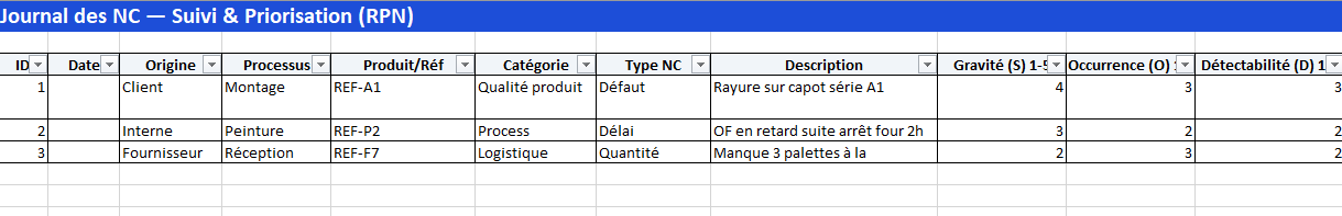 ID, Date, Origine (Client/Fournisseur/Interne), Process/Produit, Description, S/O/D, Responsable, Échéance, Statut.