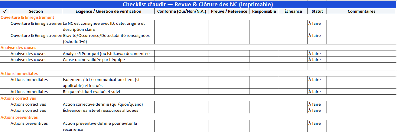 « Choisir ID NC (B3) pour pré-remplir. Documenter D0→D8. Pas de D8 sans D6 (efficacité) & D7 (prévention). » - 20_Checklist_Audit — aide-mémoire