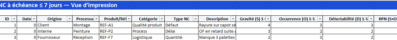 - 10_Log_NC : saisie, RPN auto, statut, échéance, Due ≤ 7 j ? automatique.