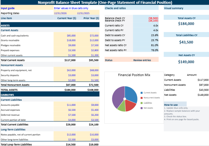 That is exactly why a one-page nonprofit balance sheet in Excel can be so useful.