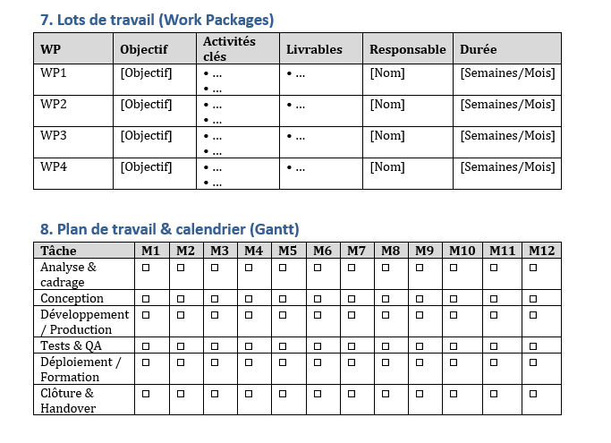 Décomposez en WP (WP1 cadrage, WP2 conception/production, WP3 tests & QA, WP4 déploiement/formation, etc.).