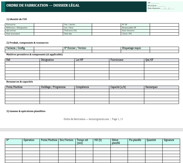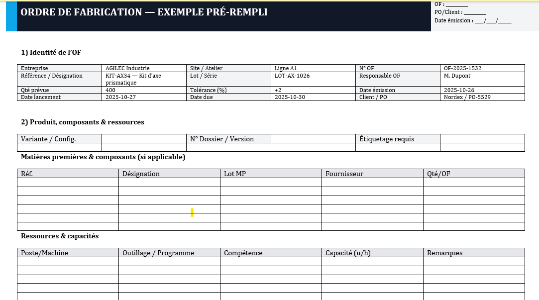 Un ordre de fabrication (OF) est le document pivot qui synchronise planification, atelier et qualité. Dans sa version A4 paysage au design sombre officiel, l’OF gagne en lisibilité, offre davantage d’espace horizontal pour les colonnes critiques, et supporte mieux l’annotation au poste. Ce format facilite l’impression, la circulation en pochette, la lecture rapide et l’archivage, tout en conservant une allure professionnelle pour les réunions, audits et revues de production.