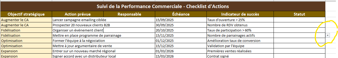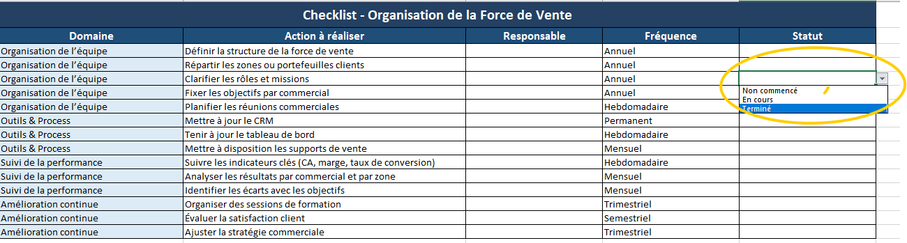 Le tableau Excel que nous avons créé intègre une colonne de statut (“Non commencé”, “En cours”, “Terminé”) qui permet de mesurer l’avancement en temps réel.