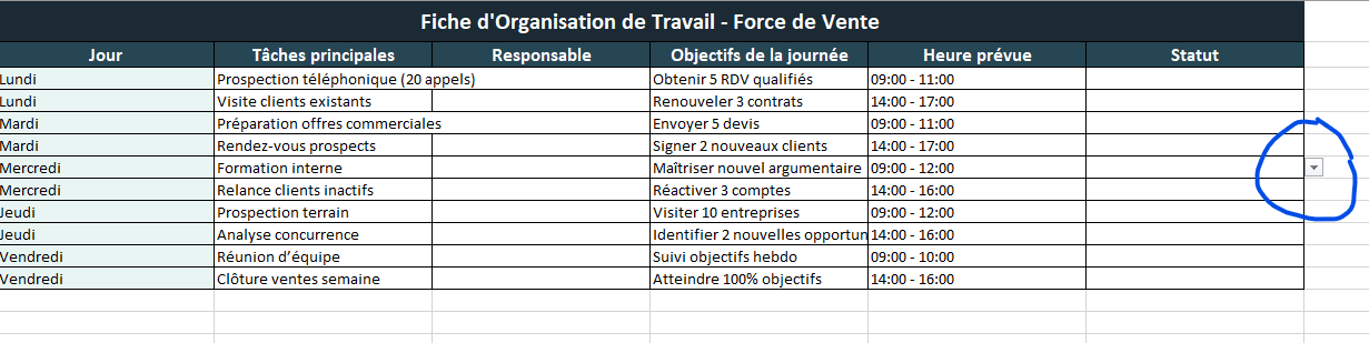 - Vendredi matin : Suivi hebdomadaire et clôture des ventes → Objectif : atteindre 100 % de l’objectif → Responsable : Manager → Statut : À faire.