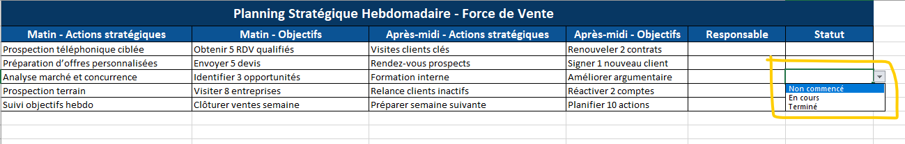 - Lundi matin : Prospection téléphonique ciblée → Objectif : 5 rendez-vous qualifiés → Responsable : Commercial A → Statut : En cours.