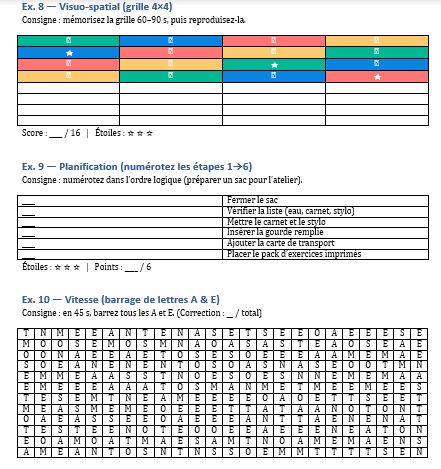 - Bloc 3 (8–10 min) : flexibilité/planification ou visuo-spatial, selon l’objectif.