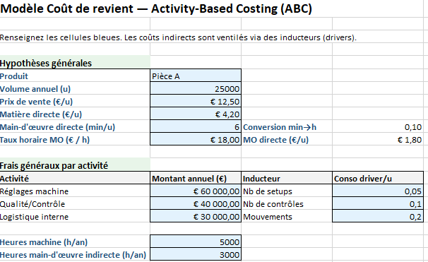 Le modèle de coût de revient veut attribuer précisément les frais indirects à vos produits/services selon des inducteurs (drivers) pertinents : réglages, contrôles qualité, manutention interne… L’ABC évite les clés arbitraires et fiabilise vos prix de revient et marges.