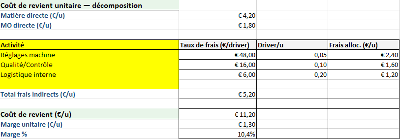 - Calculs : taux par activité, frais alloués €/u, coût de revient, marge €/u et %.