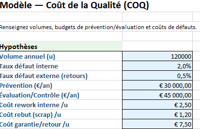 - Paramètres : volume, taux de défauts, budgets P/A, coûts rework/scrap/garantie.