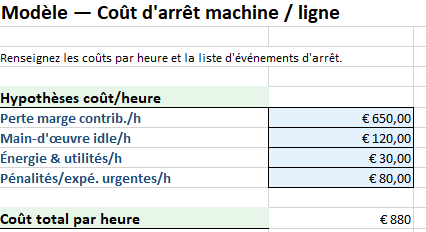 - Objectif : −20% h sur 2 causes majeures → calculez € gagnés et priorisez (maintenance, SMED, pièces critiques).