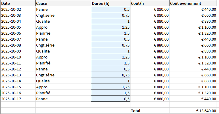 - Évènement d’arrêt : date, cause, durée (h), coût/h.