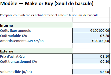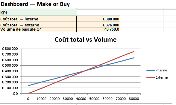 Comparer fabrication interne vs achat externe et calculer le volume de bascule Q*. Indispensable pour vos décisions d’outsourcing, saturation d’atelier, ou renégociation fournisseur.