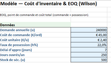 - EOQ réduit le coût annuel total, mais stock moyen ↑; simulez h% et C pour arbitrer service vs cash.