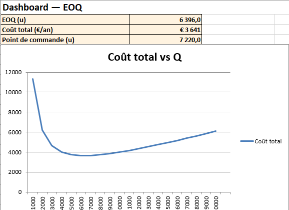 Minimiser le coût total d’approvisionnement (commandes + possession) et fiabiliser le point de commande avec stock de sécurité.