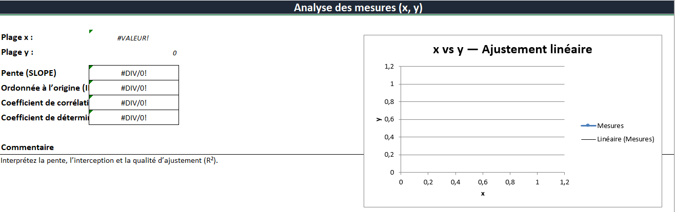 - Analyse & Graphique : nuage de points, pente, ordonnée à l’origine, R et R² (calculs automatiques) + droite de tendance affichant équation et R².