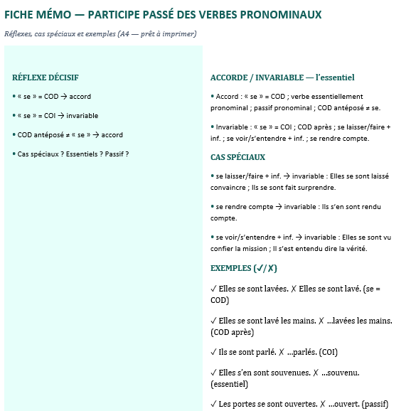 - Négliger les essentiels pronominaux : s’apercevoir, se souvenir → accord.