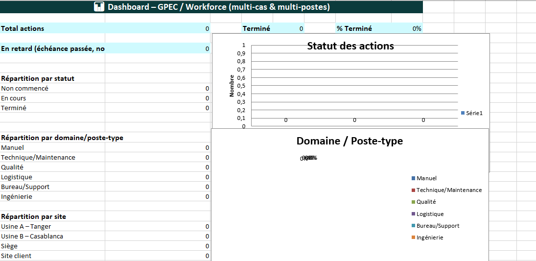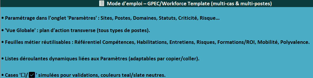 Cet outil Excel a été conçu pour planifier, suivre et analyser toutes les actions liées à la gestion prévisionnelle des emplois et des compétences (GPEC) dans différents contextes.