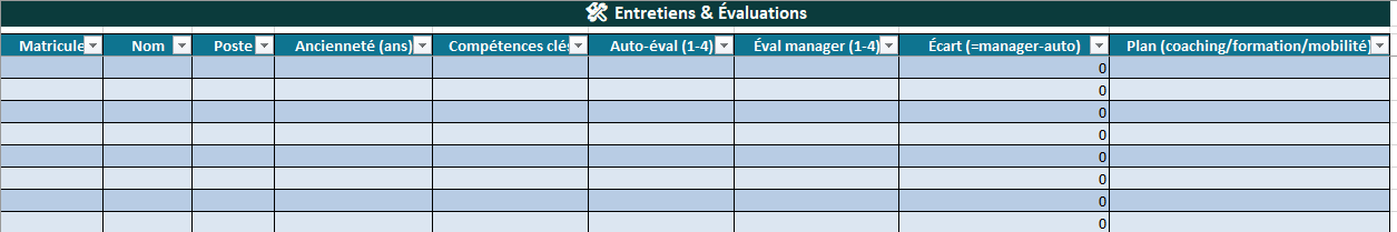 - Entretiens & évaluations : écarts entre auto-évaluations et évaluations managers.