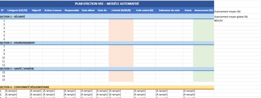 Voici votre modèle avancé de Plan d’Action HSE prêt à l’emploi, avec :