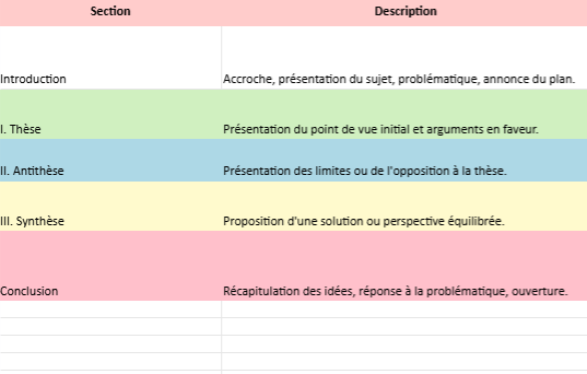 - Le fichier contient les principales sections d’un plan dialectique : Introduction, Thèse, Antithèse, Synthèse, et Conclusion.
