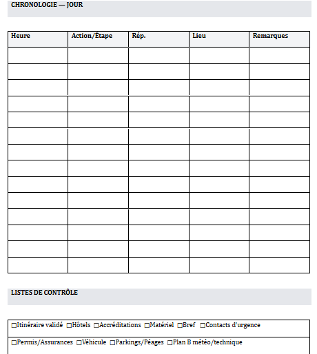 - Départ : documents véhicule, attestations assurance, inventaire bacs, outils, EPI, chargeurs, consommables, plans B, contacts jour J.