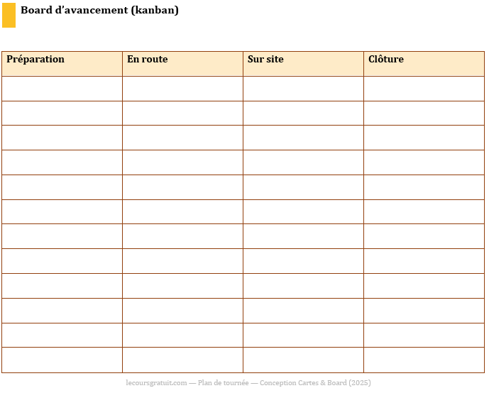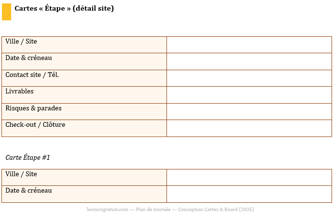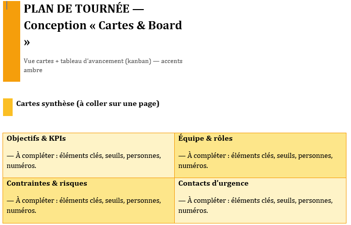 Ce guide accompagne vos modèles Plan de tournée (Conception “Cartes & Board” et A4 N&B imprimable) et vous donne une méthode pas-à-pas, des checklists et des formulations prêtes à copier. L’objectif : sécuriser la préparation, fluidifier l’exécution et capturer les apprentissages. Une tournée réussie repose sur un plan clair, une exécution disciplinée et un retour d’expérience exploité. Avec vos modèles et ce guide, vous avez un système complet pour préparer, piloter et améliorer chaque date.