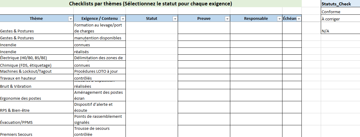• SST_Checklists : sous-tableau par thèmes (Gestes & Postures, Incendie, Électrique, Chimique, LOTO, Hauteur, etc.) avec Statut = Conforme / À corriger / N/A, Preuve, Responsable, Échéance.