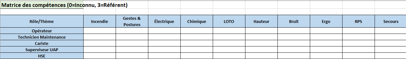 • une matrice de compétences (0→3) par rôle et par thème ;