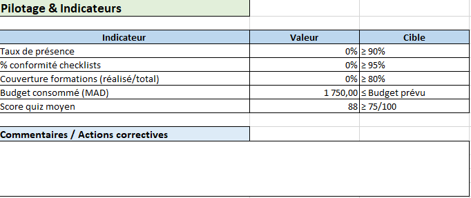 Intégrez ces KPI dans la fiche de formation SST et dans le rapport de formation SST global du mois ou du trimestre.