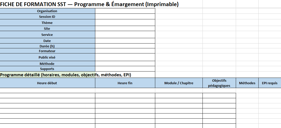• SST_Fiche_Imprimable : version A4 prête à imprimer, intégrant Programme détaillé + Feuille d’émargement (20 lignes) + rappels d’obligations et zones de visa.