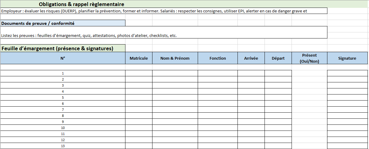 ÉmargementNom, fonction, arrivée/départ, présence (Oui/Non), signaturePrévoyez au moins 20 lignes, plus un cadre « Visa formateur / Responsable HSE ».