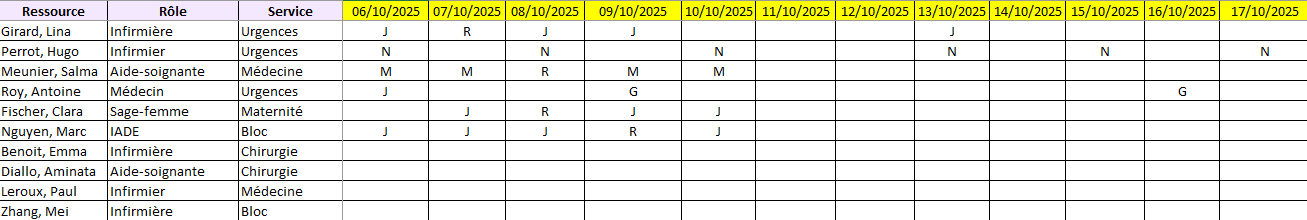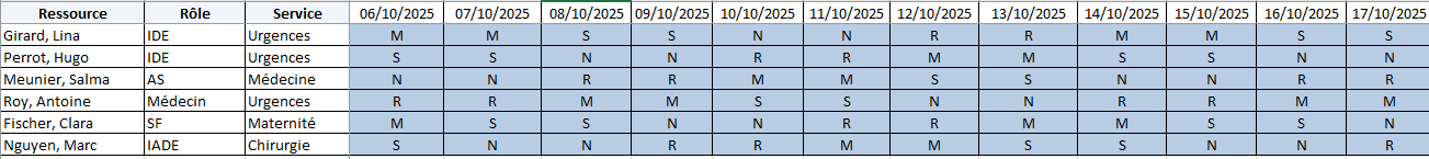 - Ce que vous planifiez : codes J/M/S (jour), N (nuit), G (garde), R/CONG/ABS.