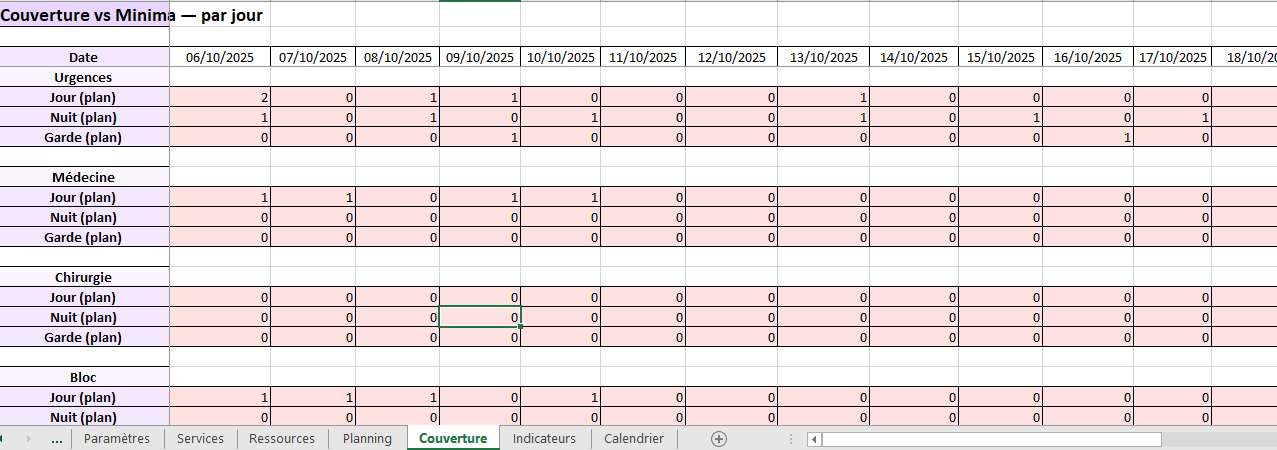 - Calculs utiles (heures/sem., charge par acuité, couverture vs minima).