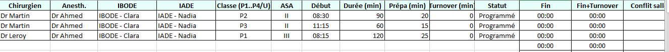 - Ce que vous planifiez : Salle, Patient, Équipe, Début, Durée, Préparation, Turnover.