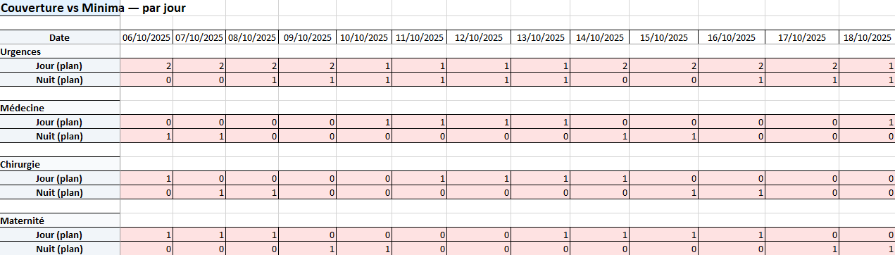 - Urgences (Shifts Hôpital) : déficit Nuit récurrent le vendredi → augmenter Min_Nuit ou déplacer une garde du samedi si flux.