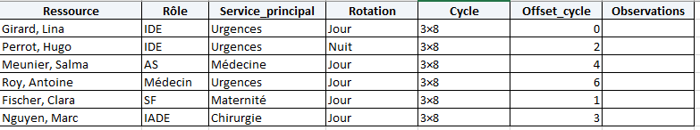 Minima par rôle : scindez les colonnes “Min_Jour / Min_Nuit / Min_Garde” par rôle (IDE/AS/Médecin/IADE…) si votre service l’exige.
