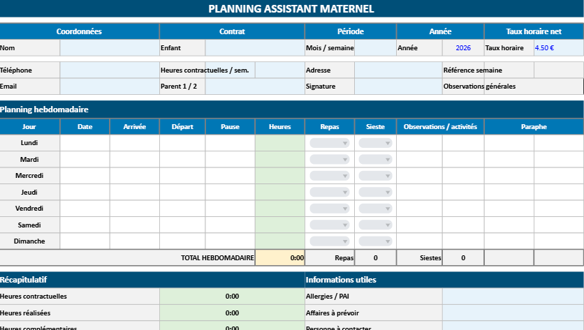 Aucun accueil ne ressemble totalement à un autre. Les horaires changent, les besoins des enfants évoluent, les habitudes familiales diffèrent d’une situation à l’autre. C’est pour cette raison qu’un modèle Excel reste particulièrement intéressant : il peut être ajusté facilement.