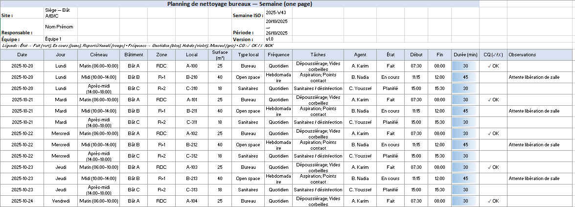 - Corps du planning (lignes) : Date, Jour, Créneau, Bâtiment, Zone, Local, Surface (m²), Type de local, Fréquence, Tâches, Agent, État, Heure début/fin, Durée (min), CQ (✓/✗), Observations.