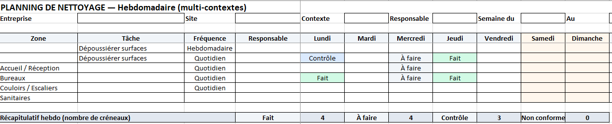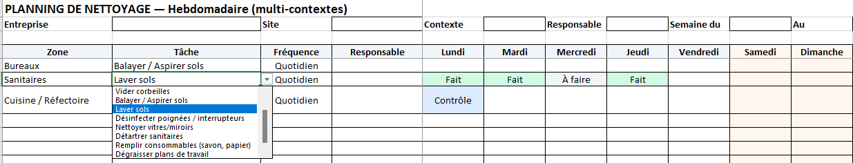 Planning de nettoyage hebdomadaire : Modèle Excel Multi contextes