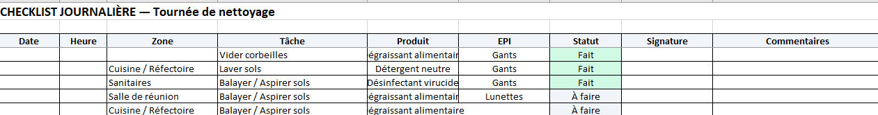 L’intérêt du semainier ne tient pas seulement à son apparence. Chaque statut devient une donnée exploitable : un Fait sans Contrôle sur une zone sensible bascule en incomplet ; un Reporté répété déclenche une analyse de cause (absence, accès, rupture de produits, surestimation de durée). Avec une signature courte et l’heure de fin, la feuille de semaine suffit à produire une traçabilité opposable, sans alourdir la charge administrative.