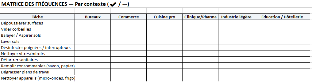 - Polyvalence : un tronc commun hebdo, plus des checklists contextuelles (Airbnb, bureau, restaurant, atelier, santé/accueil patients).