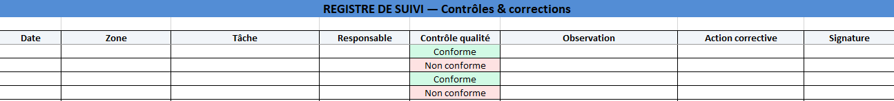 - Exporter en PDF puis afficher au mur ; conserver l’Excel comme journal maître.