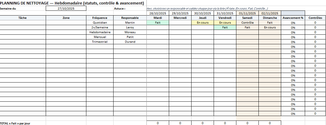 Le principe tient en peu de lignes : une semaine datée, une liste de tâches par zone, un responsable assigné, un statut standardisé. Cette mécanique, sobre, résout trois fragilités chroniques : l’oubli (tâche non faite), le décalage (fait trop tôt ou trop tard) et l’ambiguïté (fait par qui, contrôlé par qui). À l’arrivée, moins d’allers-retours entre équipes, moins de « zones grises », davantage de temps utile sur le terrain.